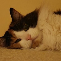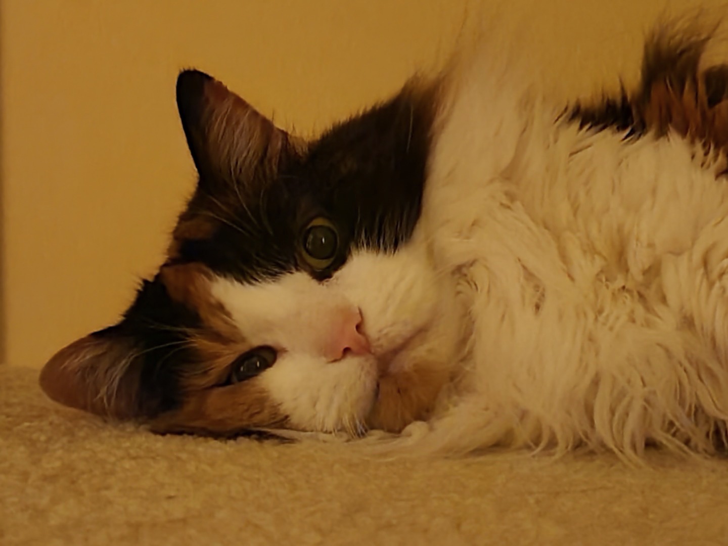 - A close-up photograph of Abby, a calico long-haired cat, lying on her side comfortably on soft beige carpeting. Warm, indoor lighting highlights her fur, creating a peaceful atmosphere.